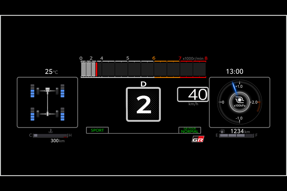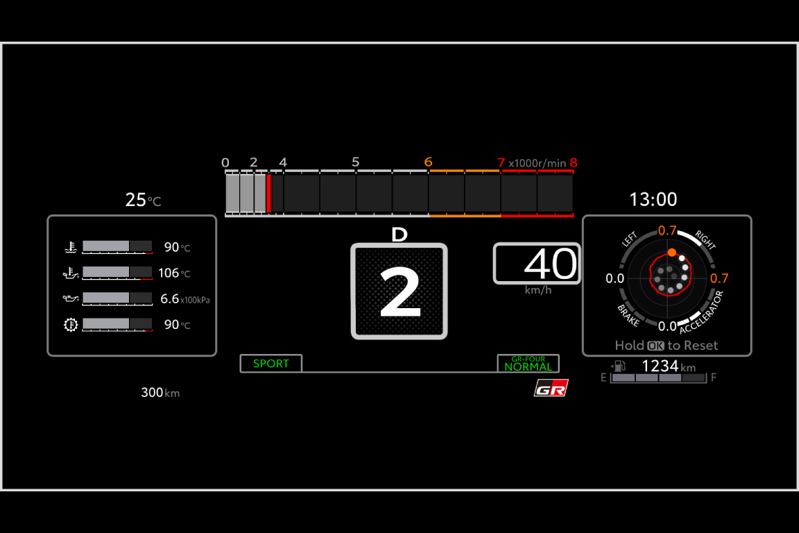 GR車両専用に開発したFull TFT*1メーターです。レーシングカーを研究し、プロドライバーの意見を取り入れながら、スポーツ走行時に必要な車両情報とその視認性を追求。回転数などを上寄りに配置したほか、エンジン冷却水の温度表示などが可能です。また、GR-DATを搭載した車両ではATフルードの温度表示が可能であるほか、シフトダウン操作時に回転数が高く、シフトダウンできない場合の通知を従来の警告音に加えてギヤ段表示部にも追加しています。この表示方法は、全日本ラリー参戦での「ヘルメット着用時でも分かりやすくしてほしい」というドライバーの要望を反映しました。タコメーターは、モータースポーツ起点の横タコバーと、日常のドライビング用の1眼タコリングの2種類の表示タイプから選択できます。